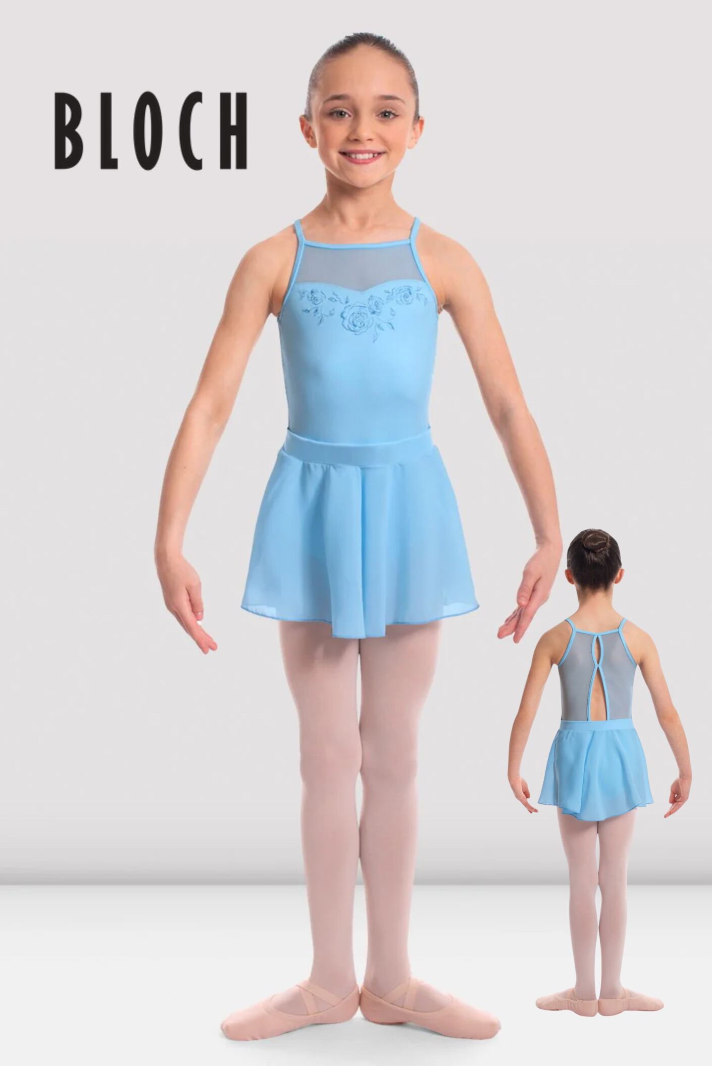 女の子用のカメオ・スカート付きレオタードは、メッシュのホルターネックライン、美しいカットが施されたメッシュの背面、そしてバラの刺繍が施されたボディスが特徴です。