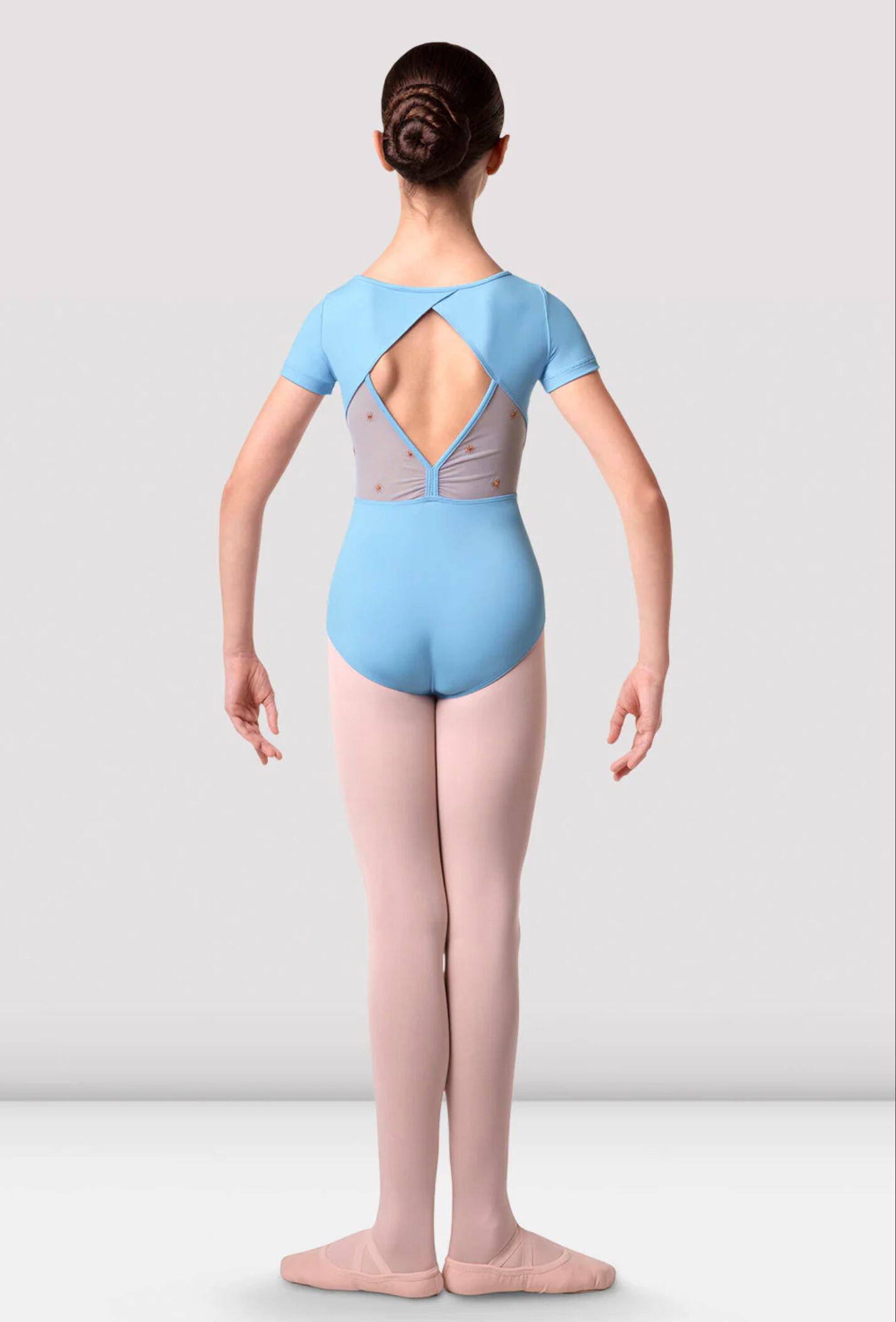スウィートハート風のメッシュネックラインとオープンバック、そして繊細なメッシュパネルに、きらめくスターダスト柄の刺繍をあしらった、春らしい華やかさが魅力のデザインです。BLOCH Stardustコレクションの一着で、ソフトなメッシュと輝くディテールが調和した、エレガントな仕上がりとなっています。